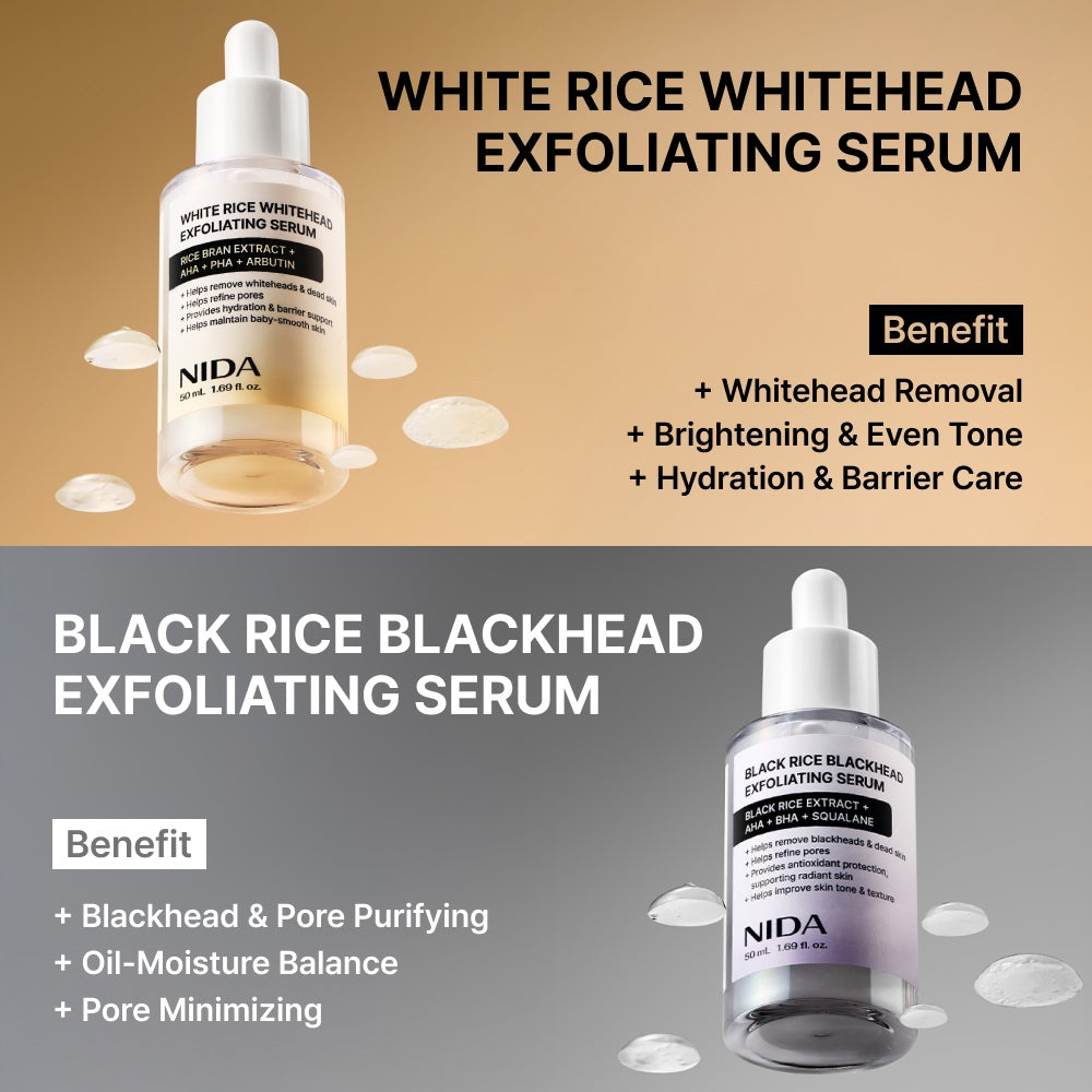 • 🤍 White Rice Whitehead Exfoliating Serum (50ml): Rice Bran Extract + AHA + PHA + Arbutin — removes whiteheads, refines pores, maintains baby-smooth skin.
