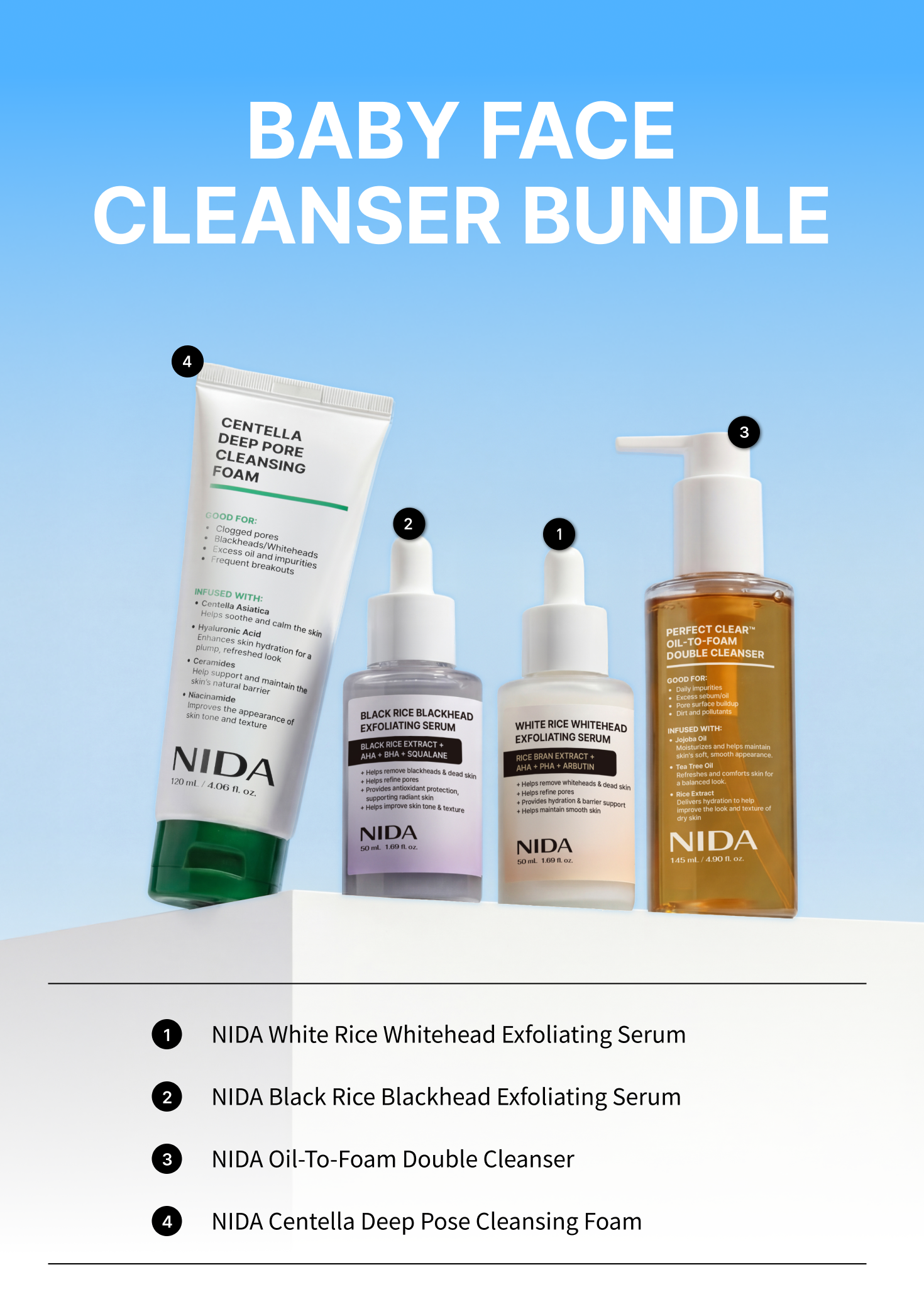 🌾 NIDA Baby Face Cleanser Bundle ✨ Double Cleanser + Cleansing Foam + Exfoliating Serums — Your Complete Pore-Perfecting Routine