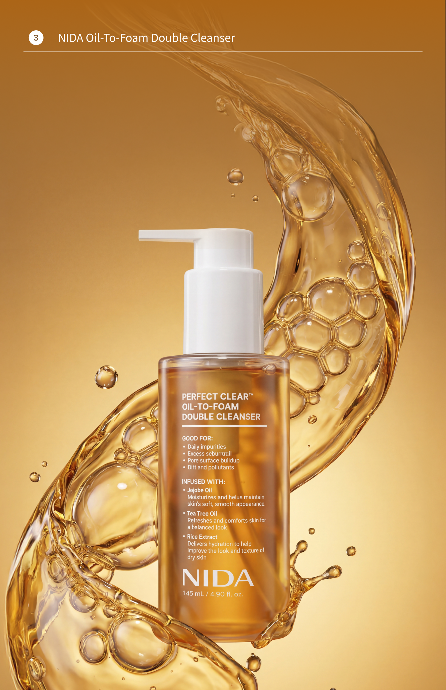 • 🧴 Perfect Clear™ Oil-to-Foam Double Cleanser (145ml): Jojoba Oil, Tea Tree Oil, Rice Extract — melts impurities, transforms into a moisturizing foam.