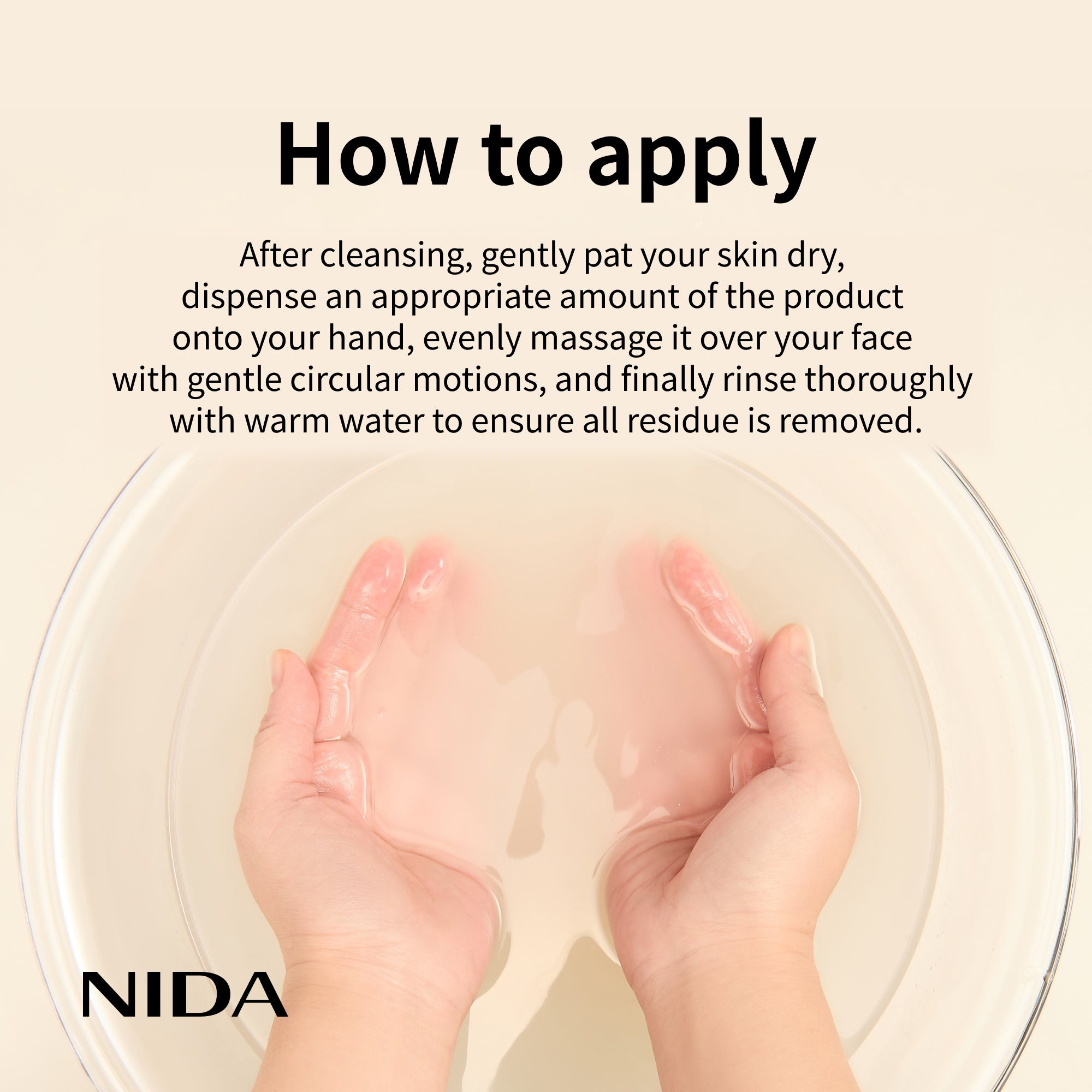 Nach der Reinigung die Haut sanft trocken tupfen, eine angemessene Menge des Produkts auf die Hand geben, mit sanften kreisenden Bewegungen gleichmäßig im Gesicht einmassieren und abschließend gründlich mit warmem Wasser abspülen, um sicherzustellen, dass alle Rückstände entfernt werden.