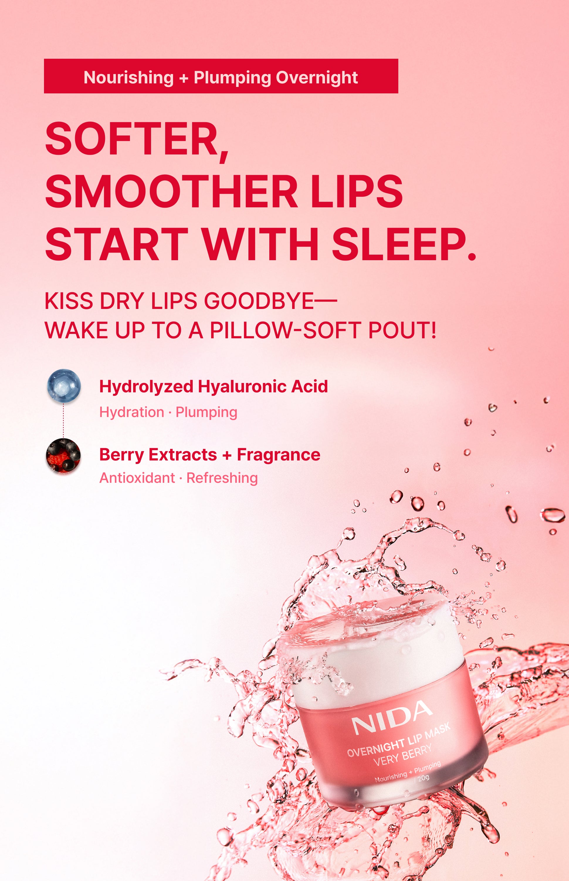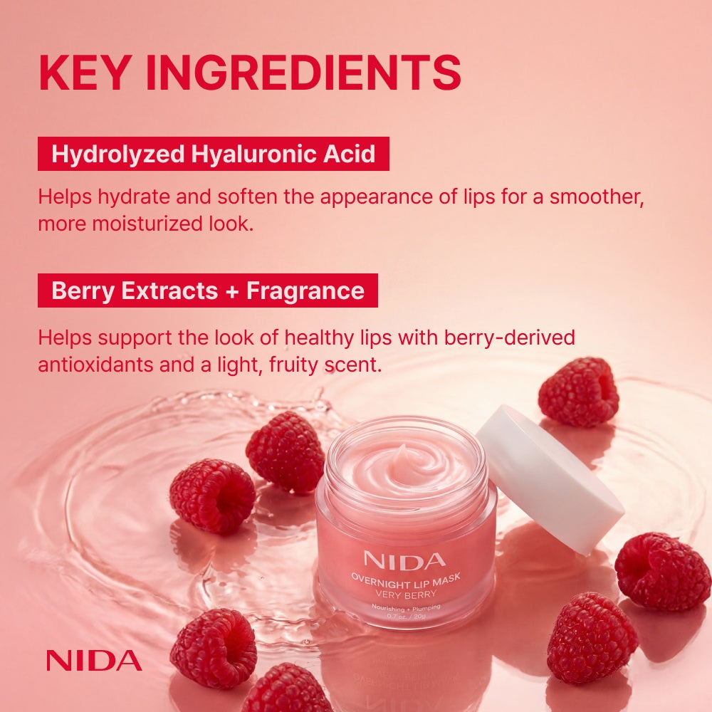 Give your lips the care—and attention—they deserve. With the NIDA Overnight Lip Mask in Very Berry, your nightly ritual for lips that look irresistibly full, soft, and touchably smooth. Wake up every morning with lips they’ll crave! 😘