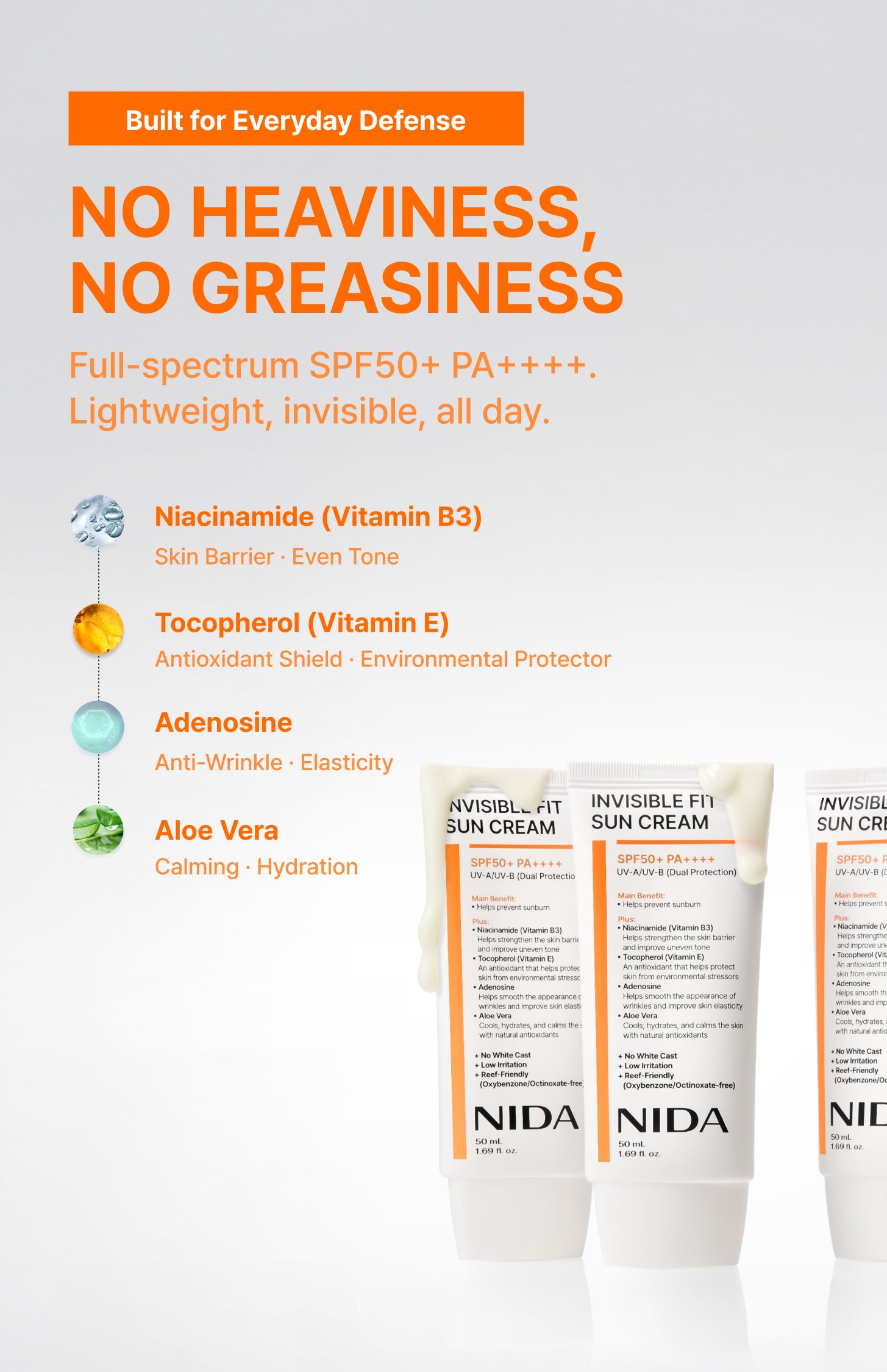 Unlike heavy, chalky sunscreens that leave you looking ghost-like, our Invisible Fit formula gives you serious SPF50+ PA++++ dual protection that disappears into your skin. No white residue. No greasy feeling. Just invisible protection.
