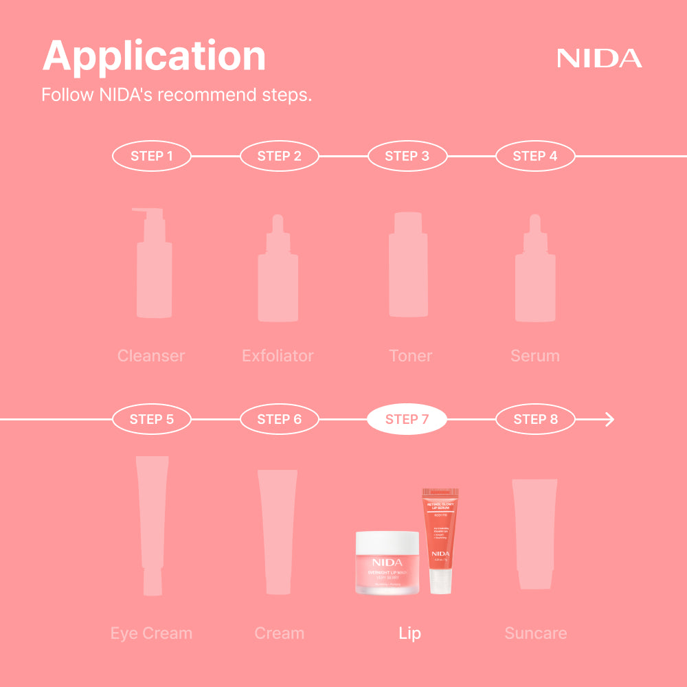 Appliquez le sérum sur des lèvres propres et sèches, en fine couche du bout du doigt ou à l'aide d'un applicateur, et laissez-le pénétrer quelques minutes. Le sérum pour les lèvres éclat au rétinol NIDA peut être utilisé matin et soir.
